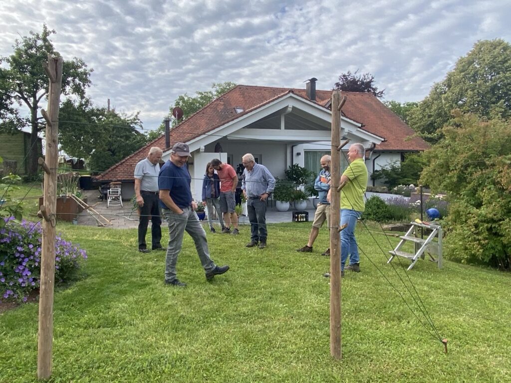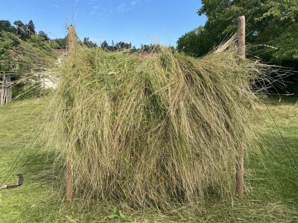 Georg Nonnenmann hat dazu ein Holzgerüst mit Spanndrähten aufgebaut. An diesen Heubock haben wir wie es früher üblich war das gemähte Gras aufgehängt, um es trocknen zu lassen. Dazu wurden früher auch sogenannte Heinzen verwendet.