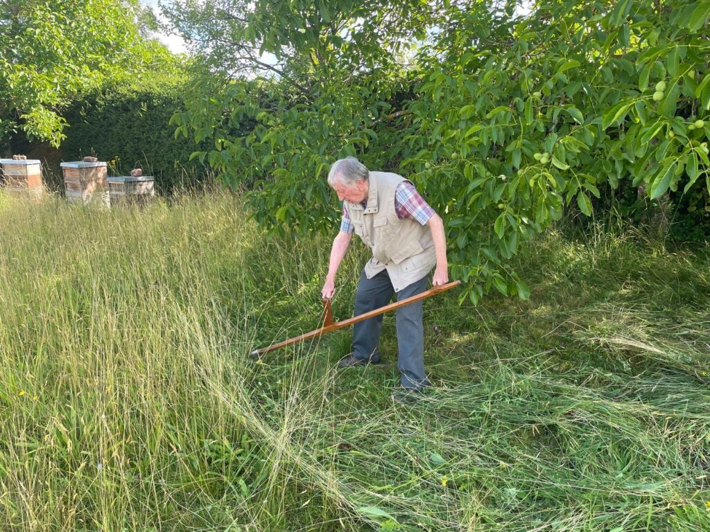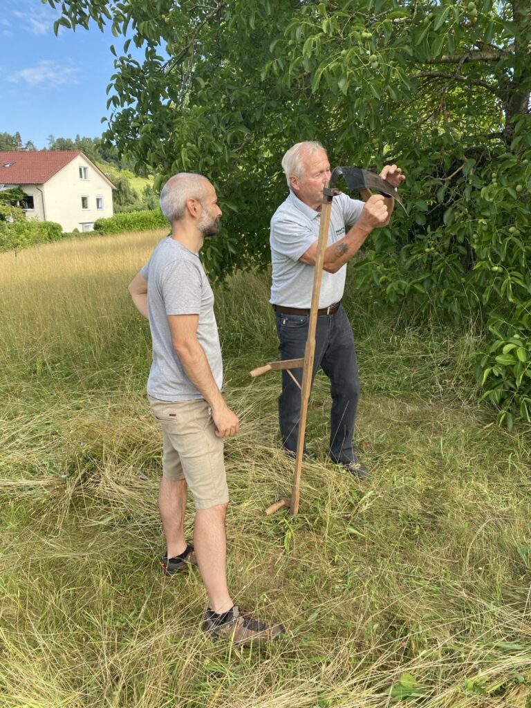 Etwas später schauten auch noch Hans Gall und seine Frau auf der Wiese vorbei. Es dauerte nicht lange und Hans hat seine Sense von zu Hause holen lassen. Und dann hat uns der Senior gezeigt, wie er noch im hohen Alter mit der Sense umzugehen versteht. Wir sind aus dem Staunen nicht mehr herausgekommen.