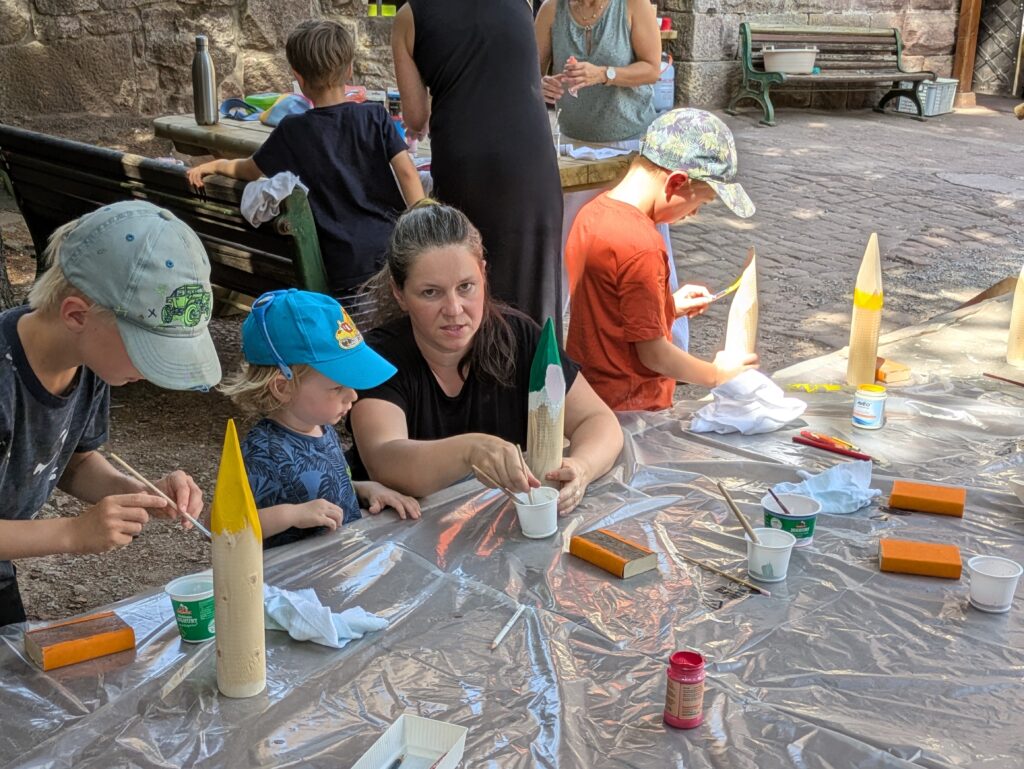 Zum Abschluss nutzten die Kinder die besondere Umgebung der Burg: Sie spielten im Burghof, erklommen den hohen Turm oder knüpften noch bunte Armbänder. Den gelungenen Nachmittag rundeten frisch gegrillte Würstchen, kühler Apfelsaft und Mineralwasser für alle ab – eine wohlverdiente Stärkung nach den kreativen Aktivitäten.