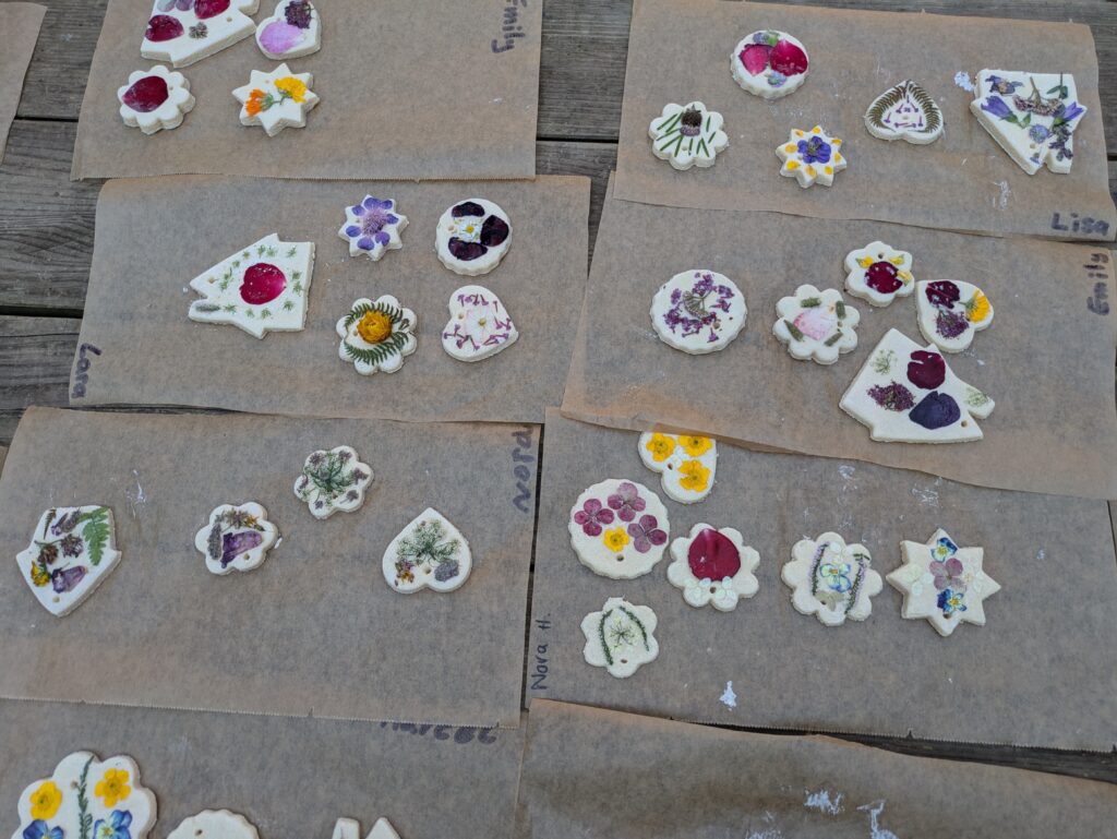 Insgesamt nahmen 26 Kinder sowie zahlreiche engagierte Helferinnen und Helfer teil. Das Programm war in zwei Bastelgruppen aufgeteilt, sodass jedes Kind die Möglichkeit hatte, beide Angebote auszuprobieren. In der ersten Gruppe wurden kleine Holzpalisaden abgeschmirgelt und bunt bemalt, wodurch fröhliche, farbenfrohe Gartenzwerge entstanden. Die zweite Gruppe gestaltete dekorative Anhänger aus Salzteig, die mit getrockneten Blumen liebevoll verziert wurden. Hochmotiviert waren die Kinder dabei ihre Kunstwerke zu gestalten. Nach einer Weile wechselten die Gruppen.