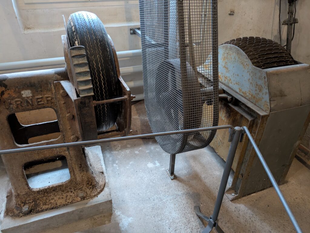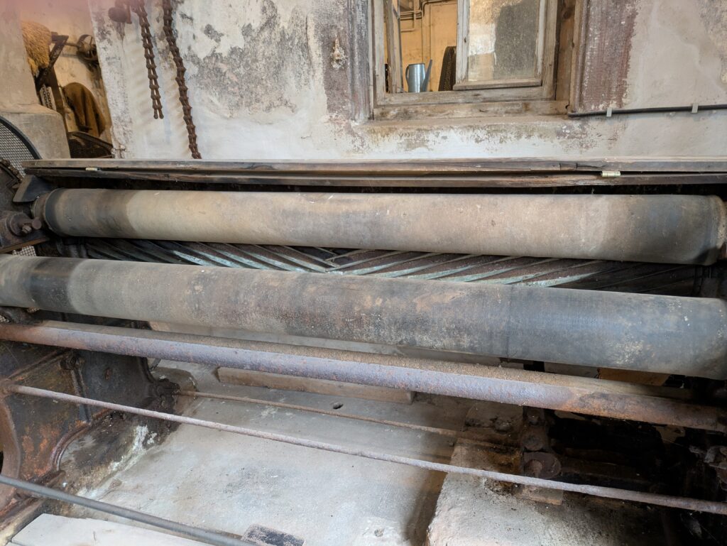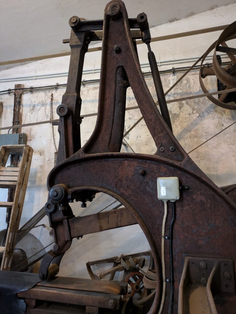 Die beeindruckendste Maschine im Obergeschoss ist eine alte Messmaschine, die  die Fläche  der Tierhäute bzw Felle in qm berechnet. Dazu wird deren Oberfläche durch Metallarme der Maschine abgetastet, wie gescannt und dabei berechnet. Ganz erstaunlich was vor 150 oder mehr Jahren schon alles möglich war!