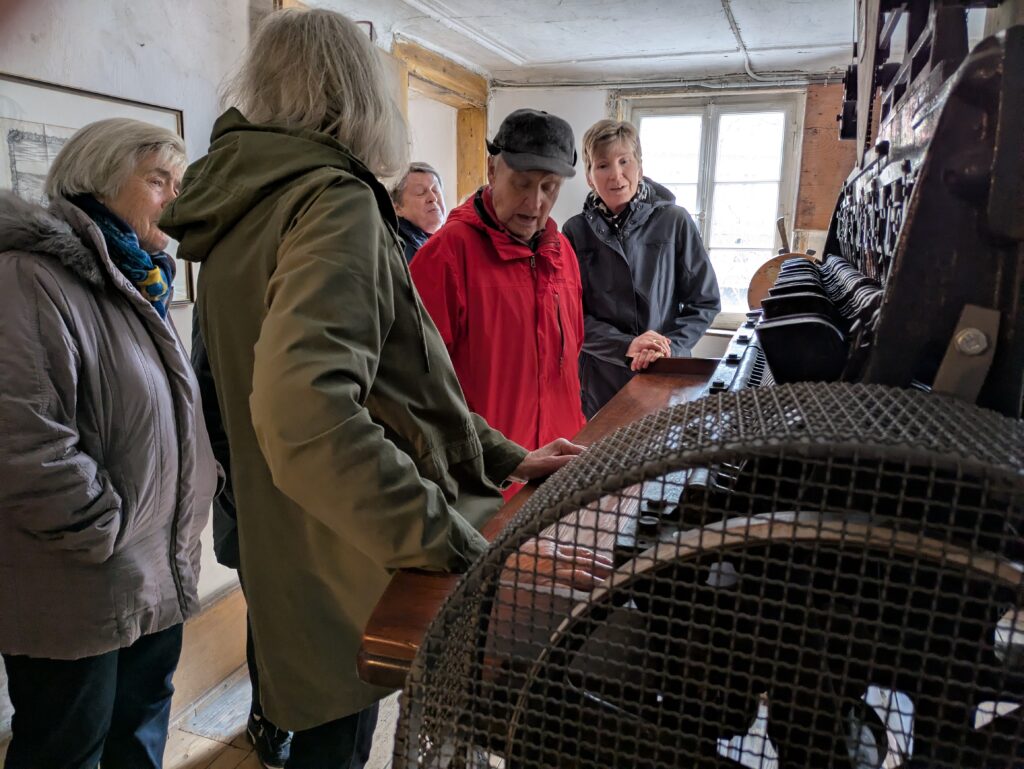 Von Frau Mannsfeld, der 1. Vorsitzenden des Bürgervereins zum Erhalt des Gerbereigebäudes  wurde die Gruppe in der ehemaligen Weißgerberei Balz herzlich begrüßt. Voller Stolz und mit viel Elan berichtete sie von den beschwerlichen Anfängen, die Gerberei zu erhalten und wieder herzurichten. Im Erdgeschoss befindet sich die Wasserwekstatt mit den großen alten Maschinen, z.B. verschiedene Schleifmaschinen, Schereisen usw  die über Transmissionen laufen – alle funktionierten noch! – und zur Verarbeitung der Tierhäute gebraucht wurden. Ein kleines und großes Fass zum Gerben, welche auch zum Färben verwendet wurden befinden sich dort ebenfalls.