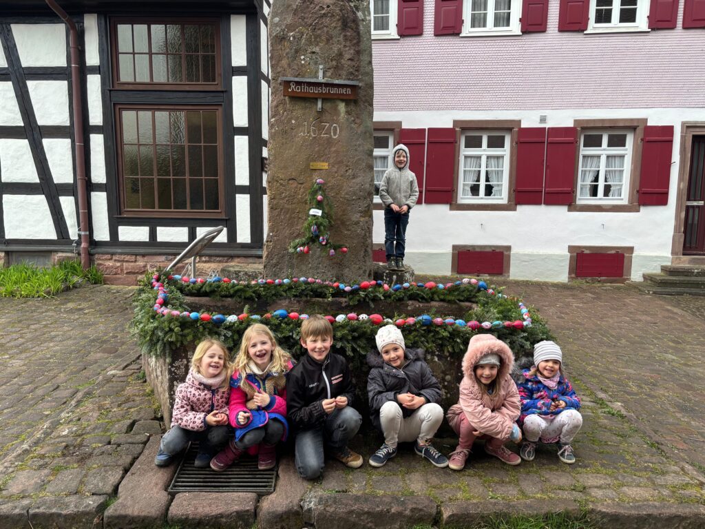Danach suchten die Kinder österliche Gegenstände bei der Rallye durch die Burg und wurden mit einem kleinen Präsent belohnt. Zur gleichen Zeit kümmerten sich Bruno Ott und Barbara Schäfer tatkräftig um die Girlanden aus Tannengrün, welche anschließend, mit den im Jahr zuvor bemalten Ostereiern, an den Brunnen befestigt wurden. Nun hüllen sich die Brunnen im Städtle und in der Burg wieder in österlichen Glanz.